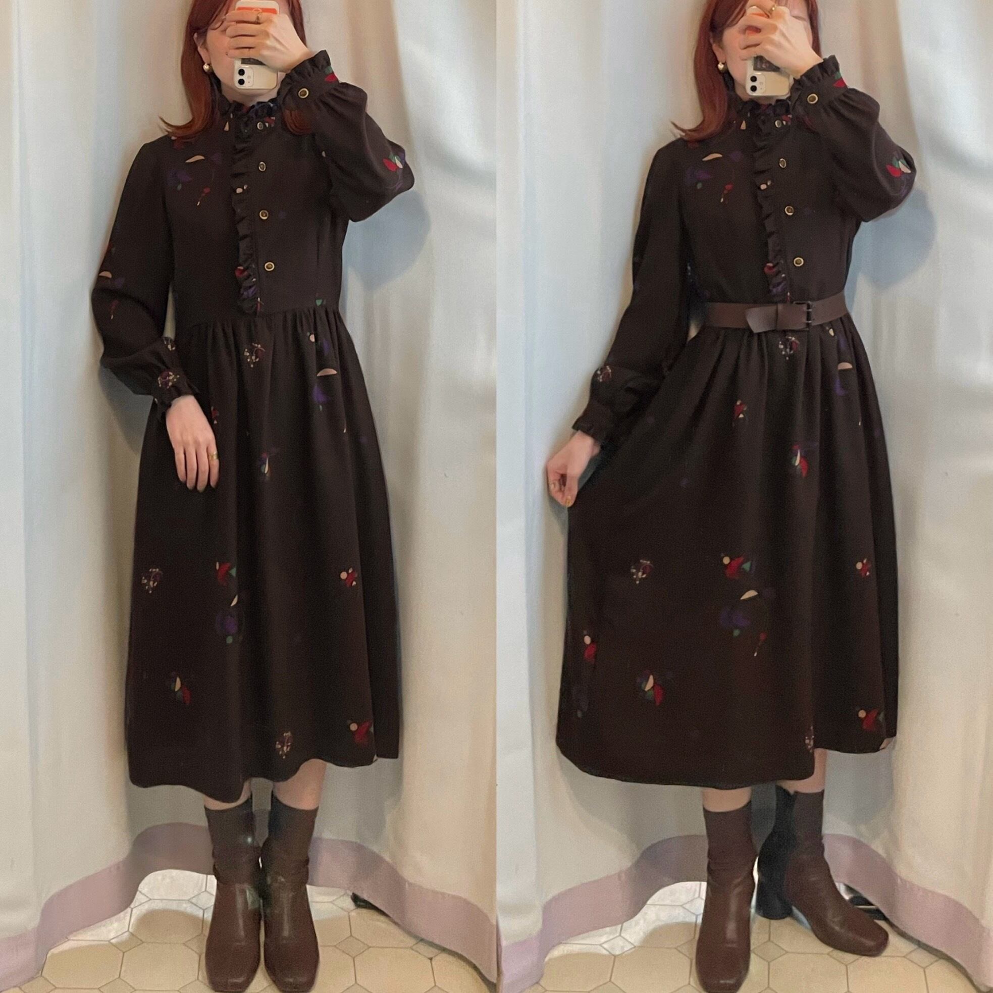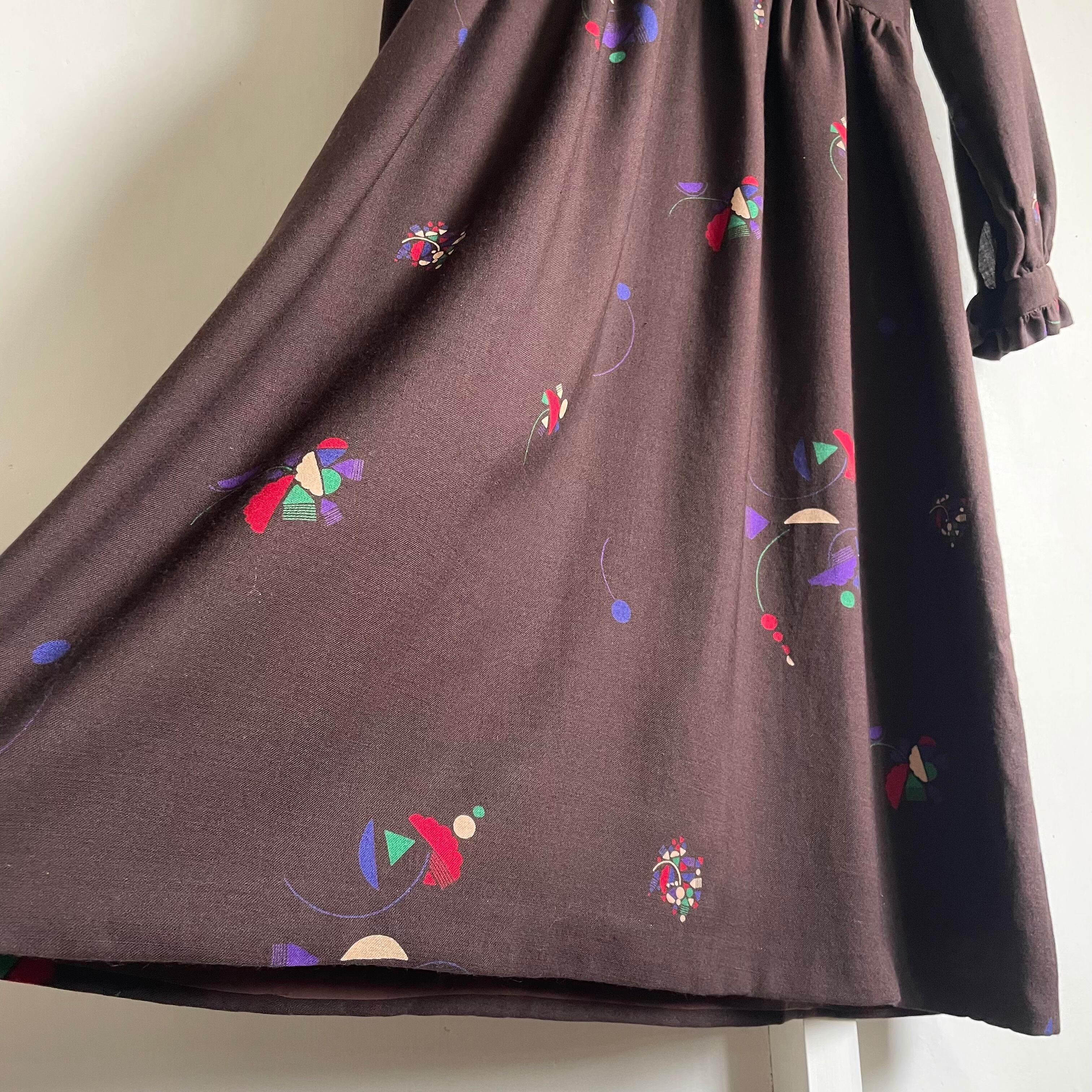 ダークブラウンにモダンポップな柄があしらわれたワンピース