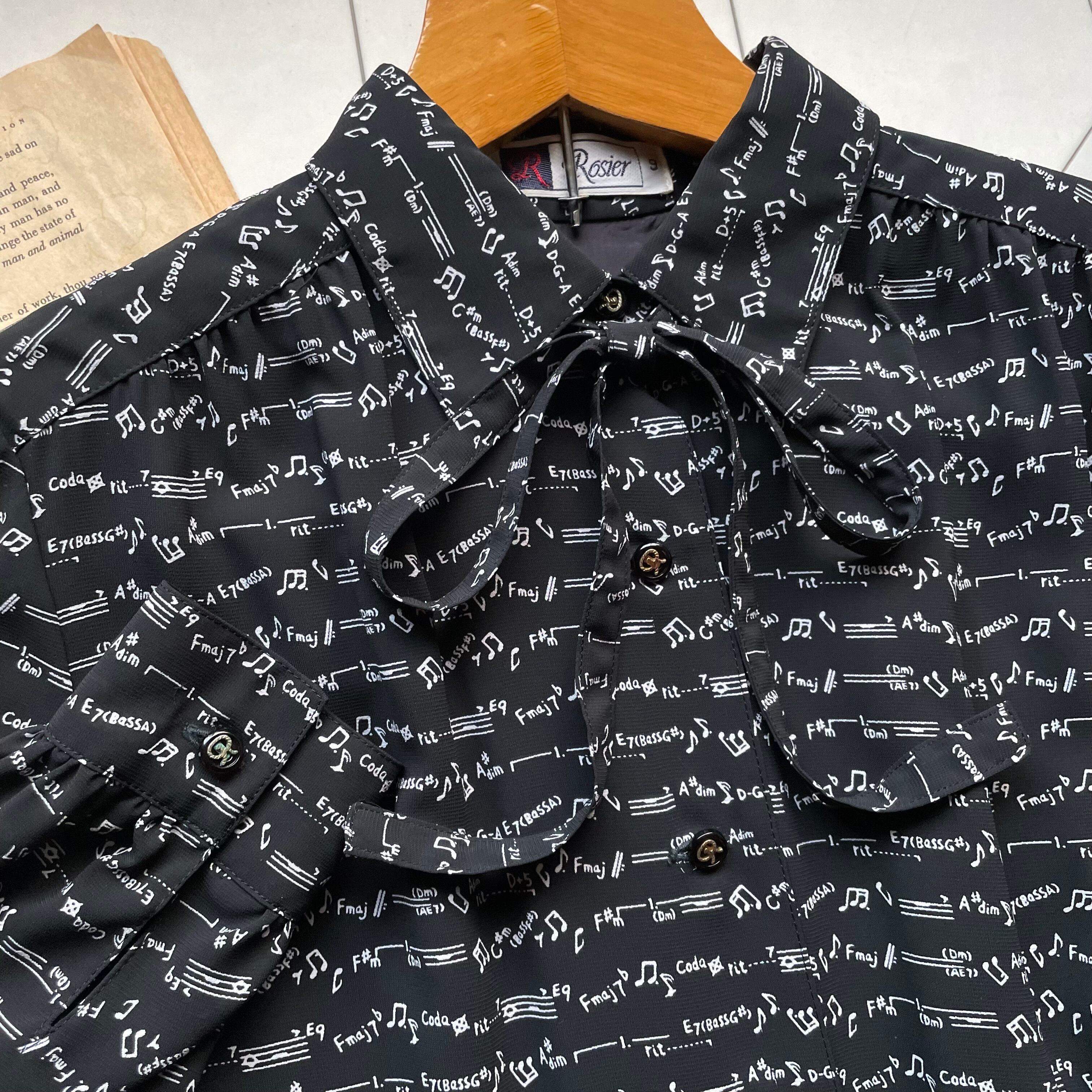 note pattern bowtie dress 〈レトロ古着 音符柄 ボウタイワンピース 黒 ジャパンヴィンテージ〉
