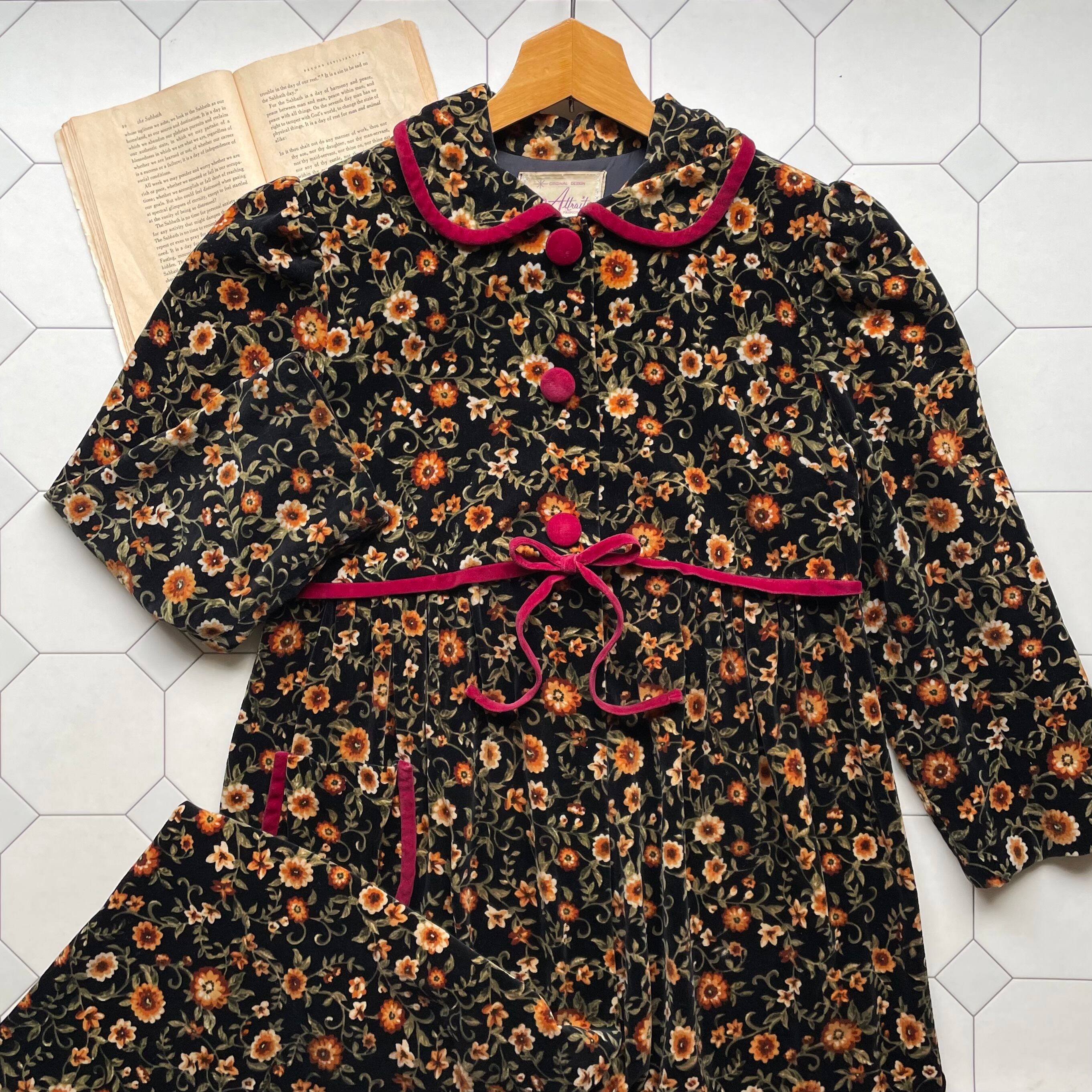 こちらはヴィンテージ感たっぷりなボタニカル柄のベロア生地の一着