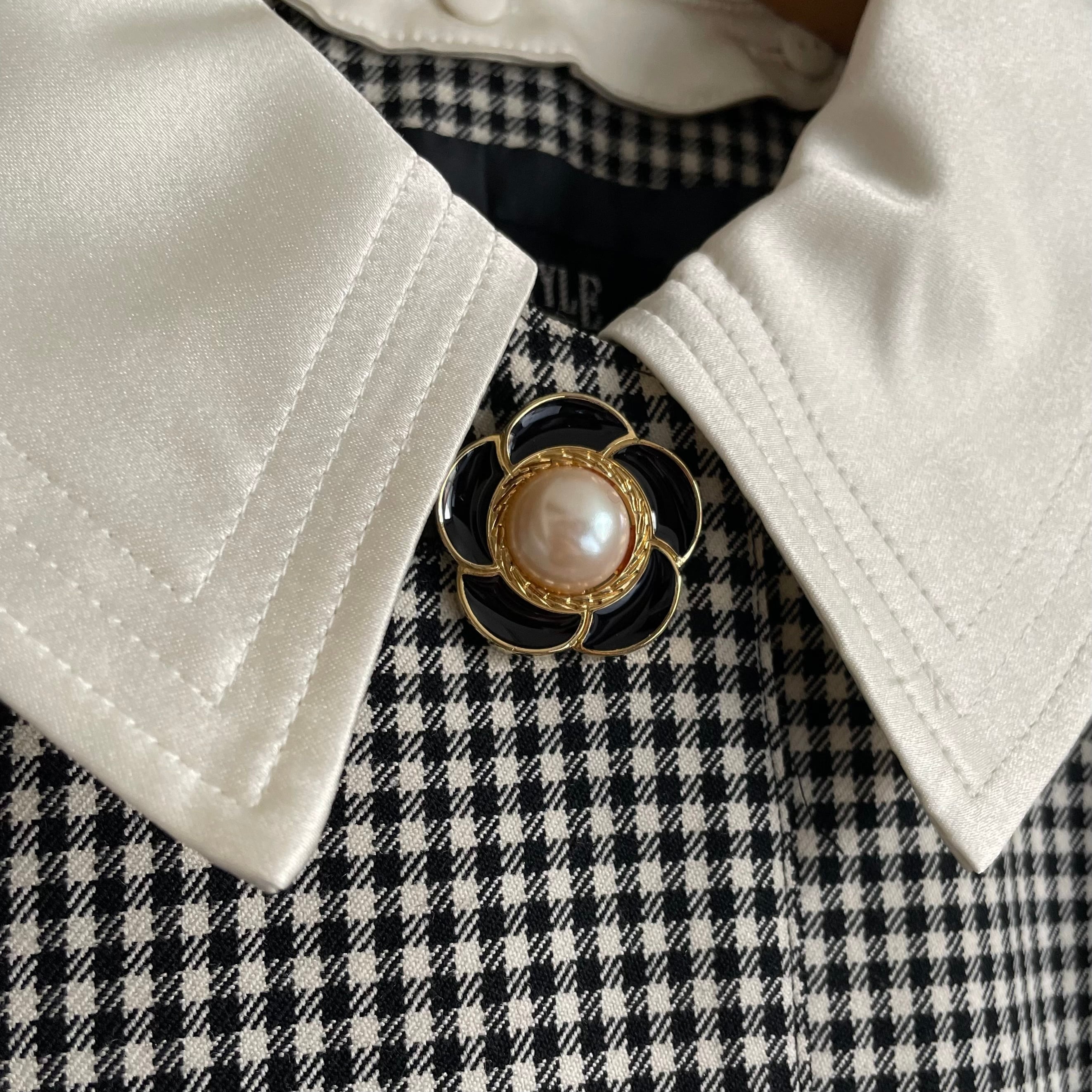 マットサテン生地の白い襟と袖口がさらにクラシカルなアクセントに
